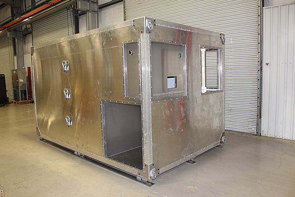 This commercial version of the military S-280 shelter meets the form, fit and function at an affordable price. It is customized with special openings and skids with wire rope vibration damping mounts.