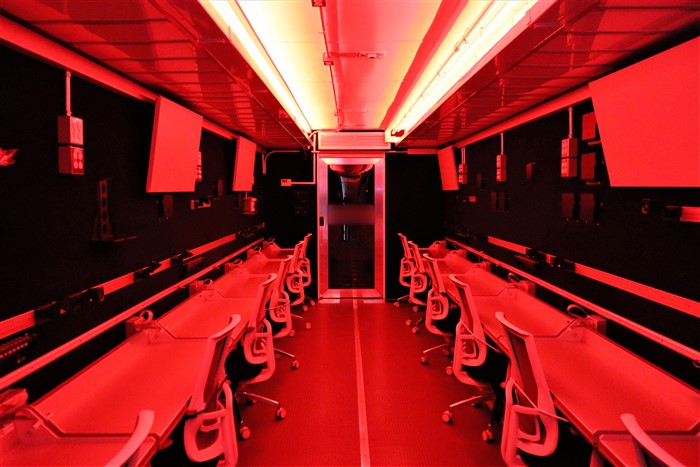 Tables 20" deep by 49" wide, locking in both deployed and stowed (down) positions, lining both sides of the SCIF (Qty 15)