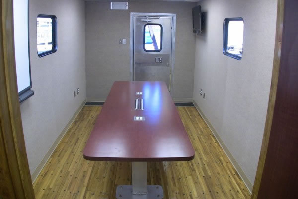 This trailer was purchased used for $7,500.00. There was damage to the outside that had to be repaired. Clegg Industries added the framing, insulation and wiring. Clegg also added an AC unit with duct work and a dropped ceiling. Clegg removed the existing rear double doors and added a single high grade rear door and side door. The openings were made for the windows and a new 14' slide-out that Clegg Industries installed. The original floor was refinished and dividing walls were built with insulation. Belly boxes were custom designed and fabricated by Clegg Industries. A glass partition wall was built to divide the work area from the main conference room. A restroom and galley were built to separate the main conference room from the rear meeting room. Quiet carpet and Nudo were used as wall coverings throughout the trailer. All cabinetry, benches, desk and conference tables were fabricated by Clegg.