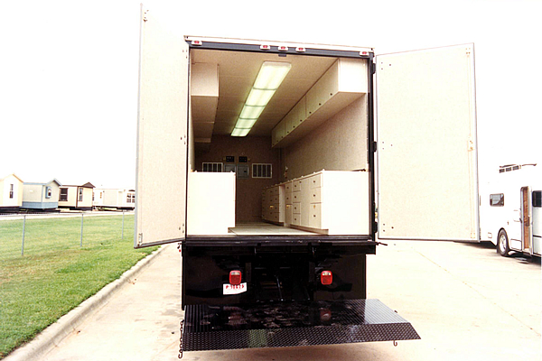 Special features of the vehicle include a rear equipment lift, two 15KW generators, two hundred feet of power cable for shorepower access and an electric or manual cable reel for quick and easy reloading of power cables. It also has custom cabinet work for computer accommodations and a custom antenna platform on the roof.