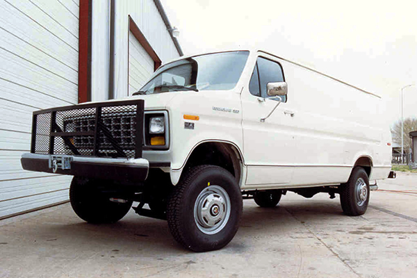 Two Ford E-350 Econoline vans were customized for the U.S. Air Force and delivered in March 1988. Each van was converted to four wheel drive and the interiors were insulated and finished in oak paneling.
